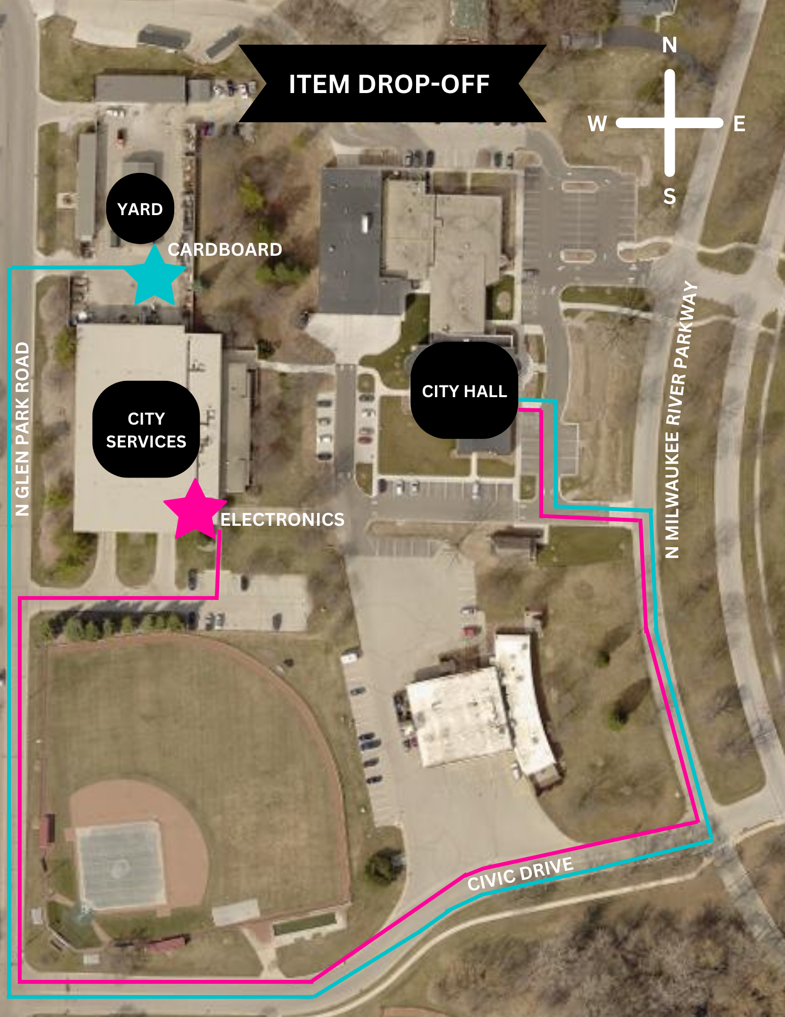 If you have any TV's or monitors, there is a $40 fee per item, which must be paid for at Glendale's City Hall prior to dropping these items off. All other items on this list may be brought directly to the City Services building located at 5930 N Glen Park Road. These items may be left outside the glass doors of the City Services building, which is shown as the pink star on this map).